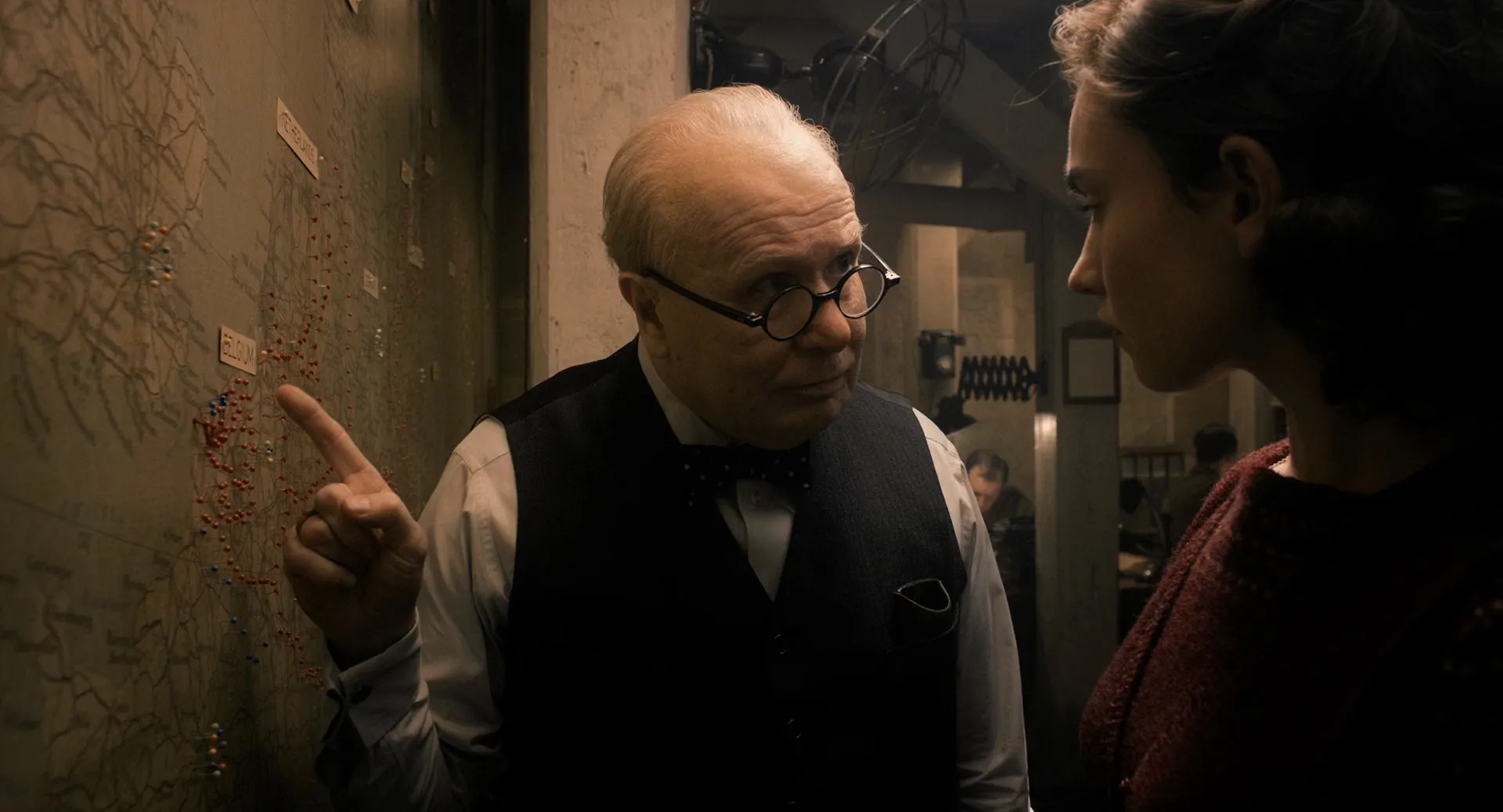 Starring: Gary Oldman as Winston Churchill, Kristin Scott Thomas as Clemmie, Ben Mendelsohn as King George VI, Lily James as Elizabeth Layton, Ronald Pickup as Neville Chamberlain, Stephen Dillane as Viscount Halifax, Nicholas Jones as Sir John Simon, Samuel West as Sir Anthony Eden, David Schofield as Clement Atlee, Richard Lumsden as General Ismay, Malcolm Storry as General Ironside, Hilton McRae as Arthur Greenwood, Benjamin Whitrow as Sir Samuel Hoare, Joe Armstrong as John Evans, Adrian Rawlins as Air Chief Marshal Dowding, David Bamber as Admiral Ramsay, Paul Leonard as Admiral Dudley Pound, David Strathairn as President Roosevelt (voice), Eric MacLennan as Tom Leonard, Philip Martin Brown as Sawyers, Demetri Goritsas as Cabinet Secretary Bridges, Jordan Waller as Randolph Churchill, Alex Clatworthy as Diana Churchill, Mary Antony as Mary Churchill, Bethany Muir as Sarah Churchill, Anna Burnett as Pamela Churchill, Jeremy Child as Lord Stanhope, Brian Pettifer as Lord Kingsley Wood, Michael Gould as Lord Londonderry, Paul Ridley as House of Commons Speaker, Robin Pearce as Ernle Hastings, Michael Bott as Equerry, Olivier Broche as Reynaud, Mario Hacquard as Daladier, Pip Torrens as BBC Producer, Edmund Wiseman as Actor, Hannah Steele as Abigail Walker, Nia Gwynne as Alice Simpson, Ade Dee Haastrup as Marcus Peters, James Eeles as Maurice Baker, Flora Nicholson as Jessie Sutton, Bronte Carmichael as Young Girl on Tube, Roisin O'Neill as Agnes Dillon, John Locke as Oliver Wilson, Joanna Neary as Margaret Jerome, Richard Glover as Brigadier Nicholson, Tom Ashley as Ramsay Staffer, Joshua Higgott as Reporter, Imogen King as Teenage Girl at Tube Map, Miles Gallant as Naval Map-Room Officer, Faye Marsay as Sybil, John Atterbury as Sir Alexander Cadogan, James Harkness as AD Nicholl (Secretary #1), Joshua James as W D Wilkinson (Secretary #2), Charley Palmer Rothwell as Christopher Wilson (Photographer), Patsy Ferran as Maid, Sarah Flind as Cook, Steffan Donnelly as Back Bencher, Kieran Buckeridge as Cecil Beaton, Johnny Otto as Member of Parliament (uncredited)