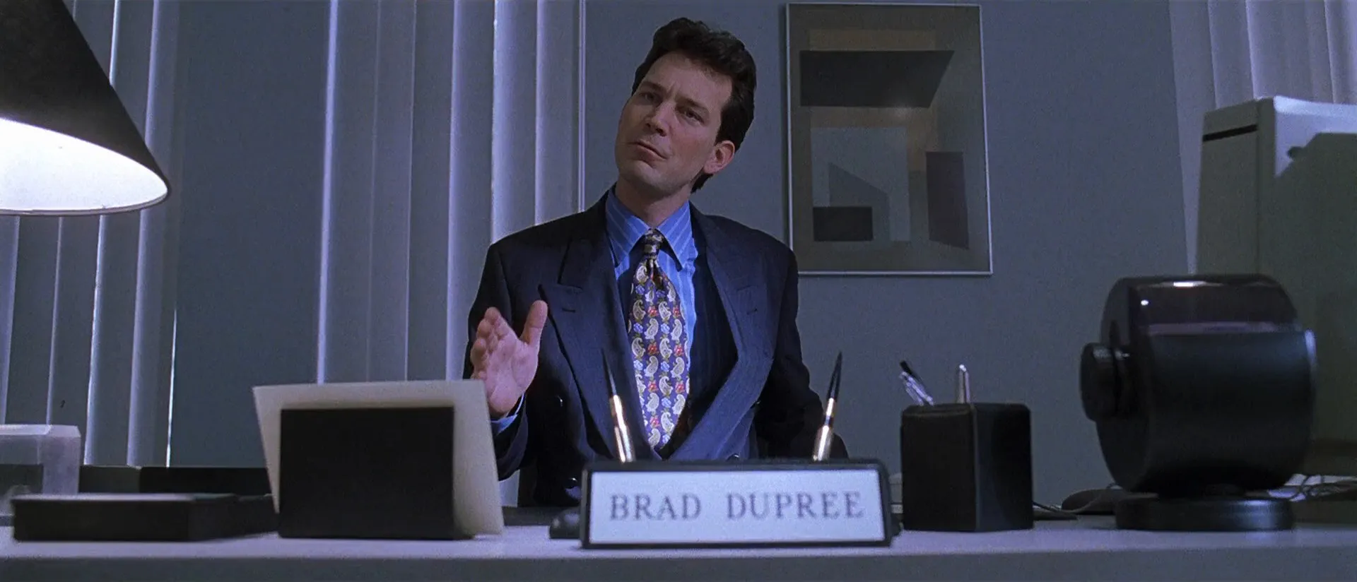 Starring: Kevin Spacey as Lester Burnham, Annette Bening as Carolyn Burnham, Thora Birch as Jane Burnham, Wes Bentley as Ricky Fitts, Mena Suvari as Angela Hayes, Chris Cooper as Colonel Frank Fitts, Allison Janney as Barbara Fitts, Peter Gallagher as Buddy Kane, Scott Bakula as Jim Olmeyer, Sam Robards as Jim Berkley, Barry Del Sherman as Brad Dupree, John Cho as Sale House Man #1, Hal Fort Atkinson as Sale House Man #2, Kent Faulcon as Sale House Man #3, Ara Celi as Sale House Woman #1, Sue Casey as Sale House Woman #2, Brenda Wehle as Sale House Woman #3, Lisa Cloud as Sale House Woman #4, Amber Smith as Christy Kane, Joel McCrary as Catering Boss, Marissa Jaret Winokur as Janine, Dennis Anderson as Mr. Smiley's Manager, Matthew Kimbrough as Firing Range Attendant, Erin Cathryn Strubbe as Young Jane, Alison Faulk as Spartanette #1, Krista Goodsitt as Spartanette #2, Lily Houtkin as Spartanette #3, Carolina Lancaster as Spartanette #4, Mona Leah as Spartanette #5, Chekesha Van Putten as Spartanette #6, Emily Zachary as Spartanette #7, Nancy Anderson as Spartanette #8, Reshma Gajjar as Spartanette #9, Stephanie Rizzo as Spartanette #10, Heather Joy Sher as Playground Girl #1, Chelsea Hertford as Playground Girl #2, Elaine Corral Kendall as Newscaster (uncredited), David C. Fisher as Wedding Guest (uncredited), Tom Miller as Advertising Executive (uncredited), Bruce Cohen as Bartender (uncredited)